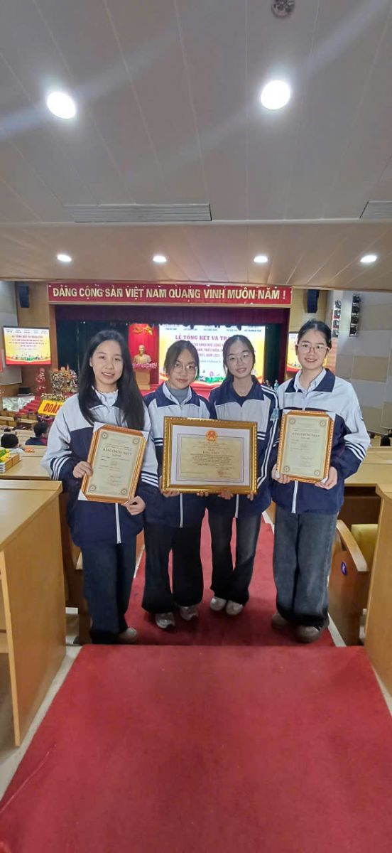 Tại lễ tổng kết, nhóm tác giả gồm 4 học sinh : Bùi Ngọc Bích – lớp 12A8; Hoàng Trần Ngọc Hân – Lớp 12A8; Nguyễn Trà My – Lớp 12A1 và Lê Thảo Nguyên – Lớp 11I được trao Bằng chứng nhận của Ban Tổ chức hội thi, cuộc thi. Vinh dự hơn nữa, các em học sinh còn được nhận Bằng khen của Chủ tịch UBND tỉnh.