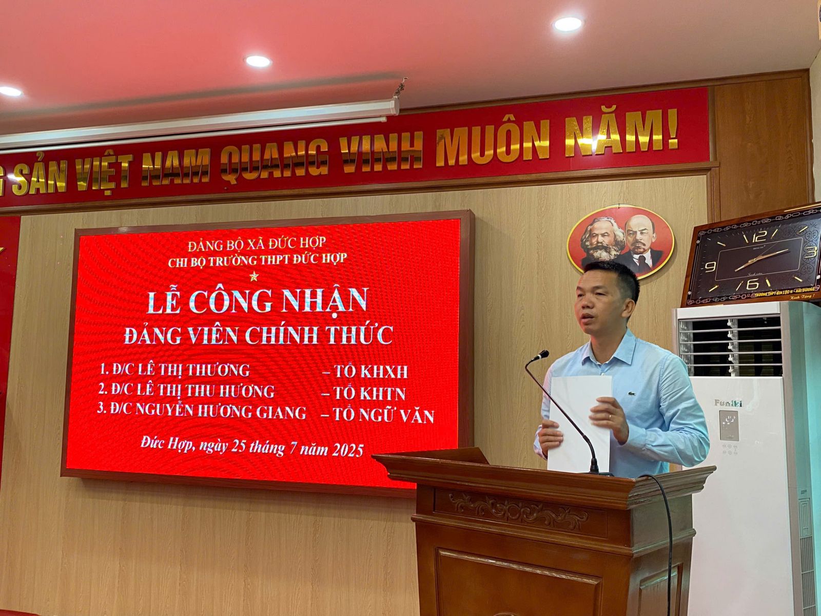 Buổi lễ có sự tham dự của toàn thể đảng viên trong Chi bộ. Đồng chí Hà Quang Vinh - Bí thư Chi bộ, đã đọc và trao Quyết định công nhận đảng viên chính thức cho ba đồng chí. Trong không khí trang nghiêm, các đồng chí Lê Thị Thu Hương, Lê Thị Thương và Nguyễn Hương Giang đã thực hiện nghi thức tuyên thệ danh dự dưới cờ Đảng, thể hiện quyết tâm trung thành với lý tưởng của Đảng và không ngừng phấn đấu.