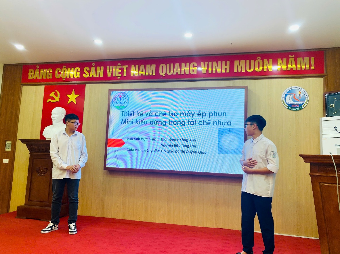 Dự án “Thiết kế và chế tạo máy ép phun mini kiểu đứng trong tái chế nhựa” của Trường THPT Khoái Châu. Sản phẩm hướng tới giải pháp công nghệ xanh, góp phần nâng cao ý thức bảo vệ môi trường thông qua tái chế chất thải nhựa.