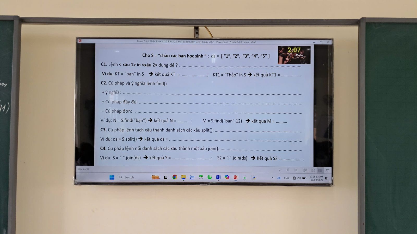Đại diện các nhóm lần lượt trình bày kết quả, các nhóm khác lắng nghe, nhận xét và bổ sung. Qua phần tổng kết, chuẩn hóa kiến thức của giáo viên, học sinh đã nắm được những nội dung trọng tâm của bài học, đặc biệt là ý nghĩa và cách sử dụng của các lệnh quan trọng như split() – dùng để tách xâu thành danh sách và join() – dùng để nối các phần tử của danh sách thành một xâu hoàn chỉnh.